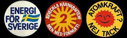 År 1980 hölls en folkomröstning om kärnkraftens framtid i Sverige. Bilden visar de tre alternativens slogans som pins eller knappar. Linje 1 (till vänster) stod för en avveckling i den takt det var möjligt, linje 2 (mitten) stod för i stort sett samma som linje 1, men att kärnkraften skulle ägas av stat och kommun. Linje 3 (till höger) ville ha en avveckling av kärnkraften inom tio år. Linje 2 vann folkomröstningen.